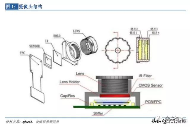 从摄像头的结构来看,主要包含镜头、基座、红外滤光片、图像传感器、PCB 和 FPC, 其中对成像质量影响最大的两个为图像传感器和镜头。