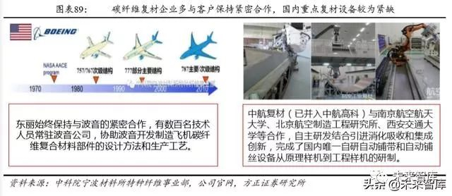 近几年我国碳纤维技术有了一定发展,但与之配套的碳纤维复合 材料技术仍有待提高,国内缺乏能够自主生产与碳纤维配套的基材树 脂的企业。首先,树脂基碳纤维复材开始主要用于高档体育器材和军 品,特别是用于军品的材料和技术,西方对我国严格封锁。其次,我 国碳纤维企业与碳纤维复材企业更多是分别发展。目前我国国内鲜有 能够研发、生产与自己碳纤维相匹配的基材树脂的企业,缺乏研发与 碳纤维匹配基材树脂和浆料的团队,且核心复材制造设备仍受到技术 限制。但在复材技术和设备方面,国内部分企业如中航复材在自动化 铺放工艺的工程化应用方面取得了较大进展;完成了国产预浸带制 备、铺带工艺等系列研究与相关工程化应用验证,已将自动铺带用于 新型飞机的机翼复合材料壁板;针对民机尾翼、机翼等课题需求,完 成了尾翼平尾蒙皮、机翼蒙皮的系列研究与验证试验。说明我国这方 面短板有望较快弥补,拓展复材市场已有一定的技术基础。