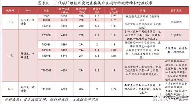 碳纤维技术发展至今已经历三代变迁,同时实现高的拉伸强度和弹性模量是目前碳纤维研制过程中的技术难点。近年来日美从两条不 同技术路径在第三代碳纤维上取得技术突破,并有望在未来 5-10 年内实现工业化生产,对于提高战机、武器的作战能力意义重大。东丽利 用传统的 PAN 溶液纺丝技术使得碳纤维强度和弹性模量都得到大幅 提升,是通过精细控制碳化过程,在纳米尺度上改善碳纤维的微结构, 对碳化后纤维中石墨微晶取向、微晶尺寸、缺陷等进行控制。以当前 东丽较为先进的碳纤维制品 T1100G 为例,T1100G 的拉伸强度和弹性 模量分别为 6.6GPa 和 324GPa,比 T800 提高 12%以及 10%,正进入 产业化阶段。美国佐治亚理工学院从原丝制备工艺入手,利用创新的 PAN 基碳纤维凝胶纺丝技术,通过凝胶把聚合物联结在一起,产生强 劲的链内力和微晶取向的定向性,保证在高弹性模量所需的较大微晶 尺寸情况下,仍具备高强度,从而将碳纤维拉伸强度提升至 5.5~ 5.8GPa,拉伸弹性模量达 354~375GPa。