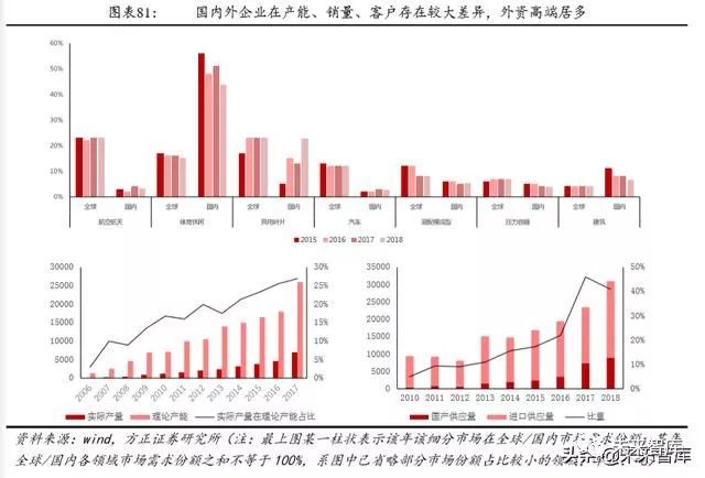 国内企业产能相对国际平均水平,呈现三多三少态势:低端产能 多,高端产能少;理论产能多,实际销量少;市场需求多,国产供应 少。( 1)产能分布看,国际碳纤维产能主要集中在航空航天等高端领 域,我国碳纤维产能主要集中在体育休闲等低端领域,低端产能相对 饱和。(2)产能产量看,2018 年我国碳纤维实际销量和理论产能之比 约 28.5%,国际平均水平为 59.8%,去除中国因素其他国家约 65.3%, 我国实际碳纤维的生产销售与理论产能之间有较大差距。(3)供需关 系看,国内有效产量不能满足整体需求,需要大量进口。三多三少特 点并非孤立形成,产能错配、外部压力、产线技术稳定性低等是主要 原因,产能销量矛盾、供应需求矛盾是结果。产能错配导致低端碳纤 维市场饱和,高端产能建设不足。国外巨头在民用领域直接和国内企 业竞争,形成较大外部压力。同时国内企业自身生产线水平有限,无 法长期稳定运行,或是生产成本偏高,导致国内实际产量与销量偏低, 国内需求依赖大量进口。