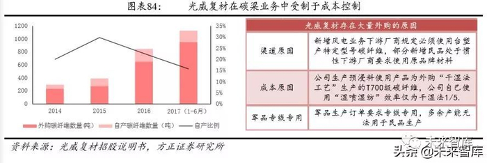 大丝束碳纤维领域看好下游扩展,下游竞争格局与小丝束不同。 目前,阻碍碳纤维材料大规模应用的主要问题在于上游高性能碳纤维 产能的不足、下游相关企业复合材料设计、应用技术储备不够等。同 时,全产业链布局企业有碳纤维预浸料、碳纤维制品的加工经验,方 便承接相关业务,能够进一步加强与下游加工制造企业的深度合作。如光威复材与维塔斯的合作,光威复材直接向维塔斯提供碳纤维进一 步深加工后的风电碳梁产品,二者的合作促进了光威复材近年民用碳 纤维业务营收的快速增长。