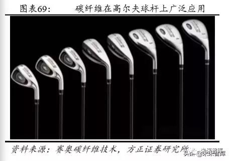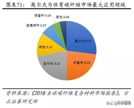 体育休闲是国内碳纤维最早规模商用、用量最大的领域,率先实 现了产业化生产。2018 年体育休闲市场碳纤维需求主要来自高尔夫、 钓鱼竿和自行车,三者约占体育总需求的 72%。据《PAN 基碳纤维的 生产与应用》,高尔夫球杆最初由木材制成,后来发展到不锈钢和铝 合金。1972 年美国莎士比亚公司和阿尔迪拉公司率先使用 CFRP 制作 球杆,该材料的球杆扭曲刚性小,击球方向稳定,杆体重量减轻还增 加了球的飞行距离。CFRP 球杆掀起高尔夫运动热潮,目前年产量约 为 4000 万副。在钓鱼竿上,CFRP 材料的应用减轻了竿体的重量,同 时提高了刚性和减振性,使得钓鱼竿的单手操作变得更加容易,减轻 垂钓者的疲劳,数十年来市场需求稳定增长。碳纤维在自行车上的应 用也较为广泛,碳纤维车架能使整车重量降低到 8kg,登坡骑行轻松, 同时较强的刚性和冲击吸收能力可以缓解由于路面不平带来的轻微 振动,使骑行过程更为舒适。
