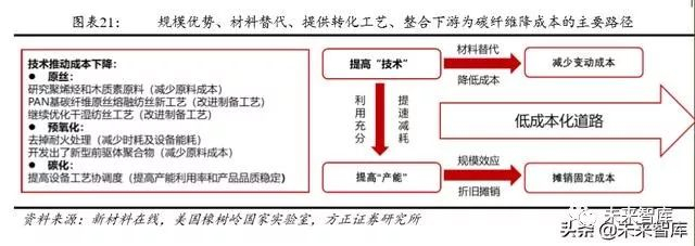 发挥规模优势是短期降成本的主要路径,寻找性价比高的前驱体 (PAN 原丝)、提高转化过程中的工艺技术以及垂直整合下游则属于长期降低成本的主要思路。( 1)据美国橡树岭国家实验室 2011 年发 表的报告,通过扩大工厂规模和生产线规模可以显著降低成本;(2) 寻找原材料替代品,比如以木质素(硬木或软木)作为替代 PAN 原丝的 资源可降低成本;(3)在原丝转化成碳纤维的转化过程,通过使用先 进的氧化碳化设备和加工工艺,优化表面处理过程可降低成本;(4) 整合下游产业从而减少中间环节成本,比如 SGL 集团与德国宝马公司 共同投资建设低成本碳纤维工厂,以及日本东丽集团、三菱公司也与 丰田汽车公司达成合作,希望开发新一代低成本碳纤维复合材料直接 运用到下游汽车产业中,减少中间无谓损失以降低最终产品的成本。