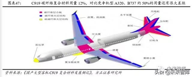 民机上,NASA 研究表明飞机上使用 CFRP 的制造成本不会超过 其节省的运行成本。民用飞机在保证乘客乘坐体验的同时,要尽可能 地提高飞机的经营效率,飞机空重的减少可以提高燃油效率从而降低 直接运行成本。世界领先民用飞机制造商波音和空客在碳纤维应用上 引领着行业方向。波音公司 B787 客机机体构造的 50%使用了碳纤维 复合材料,每架约为 35 吨。波音公司在该产品手册中表示,应用碳 纤维相比同体积传统材料的飞机减重了 40000 磅,B787 也因此将燃油效率提高了 20%,减少了 20%的废气排放。紧接着空客公司对 A350 进行重新设计,将新飞机改名为 A350XWB,其主翼、机身、尾翼全 部使用复合材料,占机身重量的 53%。我国民机碳纤维的使用相比于 波音和空客仍处于追赶阶段,2012 年 12 月中航工业西飞公司向中国 商用飞机有限责任公司交付的 C919 大型客机中央翼、襟翼及运动机 构部段是国内首次在民用大型客机主承力结构上使用复合材料。但只 有取得了中国民航局、欧洲航空安全局和美国联邦航空管理局的适航 证,C919 才能投入国际市场运营,这个过程可能需要持续几年。