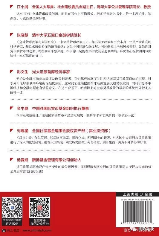 《全球货币政策与大国兴衰》一书立足货币政策历史,却不囿于政策和历史本身;立足严肃认真的科学研究,却追求通俗易懂的语言表达;立足中国经济金融发展,同时也关注全球风云变幻。如果你对货币和货币的过去、现在和未来感兴趣,相信你一定能在书中收获启迪和共鸣。再次衷心祝贺明明写出这样一本有温度的好书。