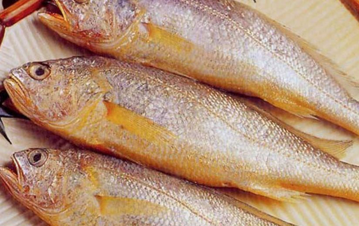 ▲黄花鱼生于东海中,鱼头中有两颗坚硬的石头,叫耳石,故又名石首鱼。