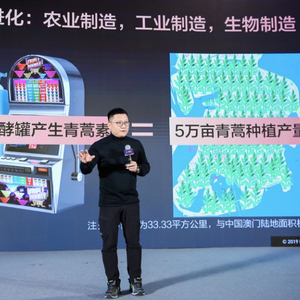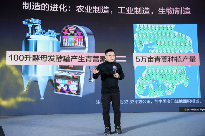 合成酵母能干什么呢?我们来看青蒿素,诺贝尔奖获得者屠呦呦发现青蒿素可以抗疟疾,实际上今天的青蒿素可以不再通过种植、收割青蒿的方式来提取,只要能把青蒿素的表达基因放到酵母菌中,一个100L的酵母发酵罐,所能产生的青蒿素相当于大约把整个澳门都种上青蒿再提取的量,差不多33平方公里的面积。