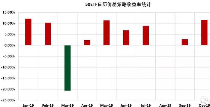 买入日历价差是指卖出近期期权合约同时买入相同行权价格的标定资产的远期期权合约,并持有该组合接近至近期期权合约到期日,做平仓了结。考虑到沪深300ETF期权及沪深300股指期权每月都会产生到期期权合约,因此,投资者可考虑构建日历价差策略。我们针对2019年上证50ETF期权合约进行了回测,入场时间选择在到期前第三个交易日,过程中不进行调仓处理,买入日历价差交易策略收益如下图: