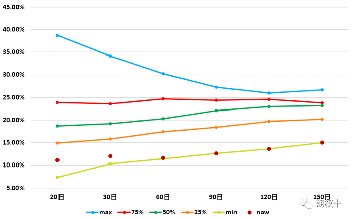 此外,沪深300指数自2018年以来价格指数的波动率分布及沪深300指数波动率锥,如图2.3、2.4,其中图2.3红线位置为当前历史波动率位置,结合历史波动率的分布及波动率锥来看,当前沪深300指数30日历史波动率为12.08%,60日历史波动率为11.66%,90日历史波动率为12.66%,沪深300指数20日至150日历史波动率处于近两年最低值。