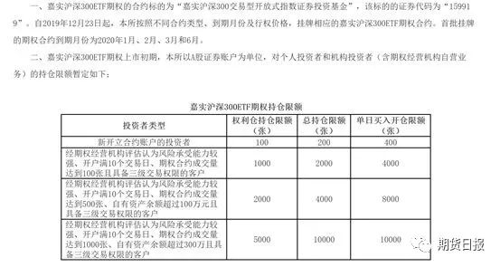 另外,沪深300股指期权上市初期实施交易限额制度。自沪深300股指期权上市首日至2020年3月的第3个星期五(2020年3月20日),客户该品种日内开仓交易的最大数量为50手,单个月份期权合约日内开仓交易的最大数量为20手。自2020年3月的第4个星期一(2020年3月23日)至6月的第3个星期五(2020年6月19日),客户该品种日内开仓交易的最大数量为100手,单个月份期权合约日内开仓交易的最大数量为50手。