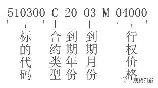 上交所ETF期权合约代码构成:标的证券代码+C或者P+到期月份+合约版本号(未经调整为“M”,首次调整改为“A”,再次调整改为“B”,依此类推)+行权价格。例如,510300C2003M04000为上交所300ETF认购期权,行权价格为4元,到期月份为2020年3月,合约未经调整。