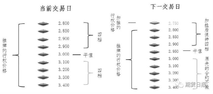 以ETF期权为例,假设标的前收盘价为3.000元/份,当日标的价格下跌至2.950元/份。由于标的价格下跌,为保证下一交易日平值行权价格上下至少有4档行权价格,加挂行权价格为2.750元/份的期权合约。