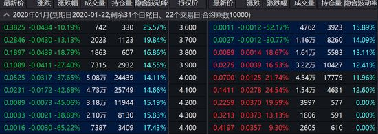 看涨期权方面,上交所300ETF购1月4400跌幅最大达65.22%,深交所300ETF购1月4500跌64.10%,中金所IO2002C4450跌29.23%;