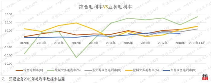 2010年起,华昌化工的外购化肥、化工品业务占总营收比重虽然大幅增加,但贸易行业的典型特征是收入、成本两头大,毛利极低,在分析公司时重点仍集中在纯碱、化肥及多元醇业务。