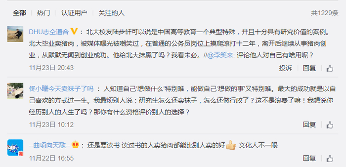 这次报道之后,“北大毕业生卖猪肉”的标题出现在了全国的新闻媒体上,引起了社会大讨论。