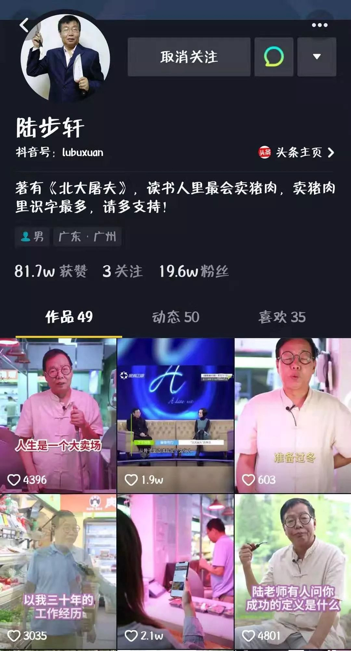 今年4月份,52岁的陆步轩开通了抖音,平时在网上普及猪肉相关的知识,或是分享自己的来时路。