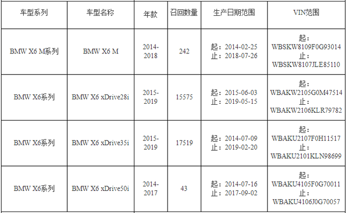 宝马(中国)汽车贸易有限公司决定自2020年3月27日起,召回2014年2月25日到2019年5月15日生产的进口X6xDrive28i、X6xDrive35i、X6xDrive50i及X6M汽车,共计33379台。