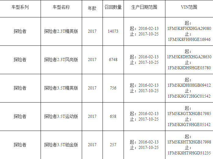 (二)从2020年1月13日起,召回2016年2月13日至2017年10月25日(含)生产的2017年款进口福特探险者汽车,共计22492辆。