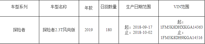 (一)从2019年12月30日起,召回2018年9月17日至2018年10月2日(含)生产的2019年款进口福特探险者汽车,共计180辆。