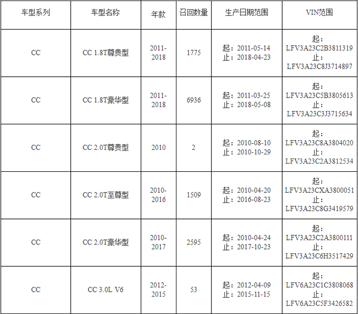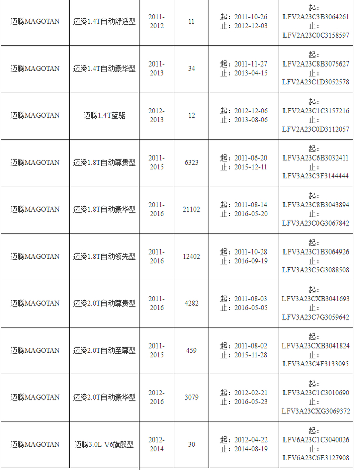 大众迈腾、CC、途观汽车在召回之列