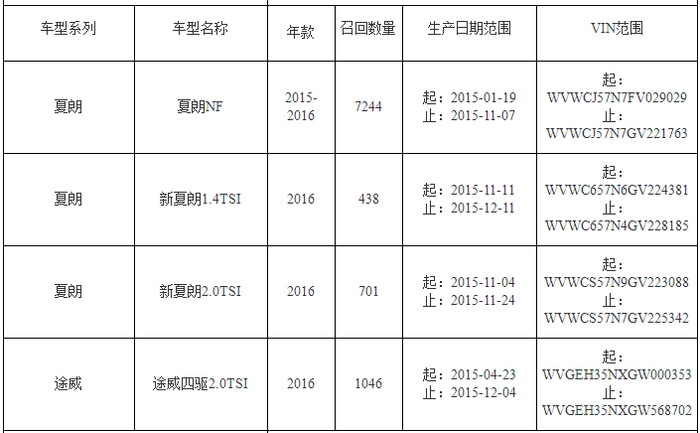 大众汽车(中国)销售有限公司、上汽大众汽车有限公司和一汽-大众汽车有限公司决定自即日起召回以下车辆,共计159167辆。