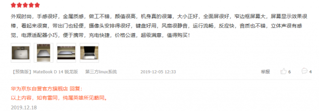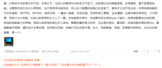 注重产品颜值党的用户,剁手后称赞华为MateBook D 系列“外观时尚”“颜值很高”“机身超薄”。