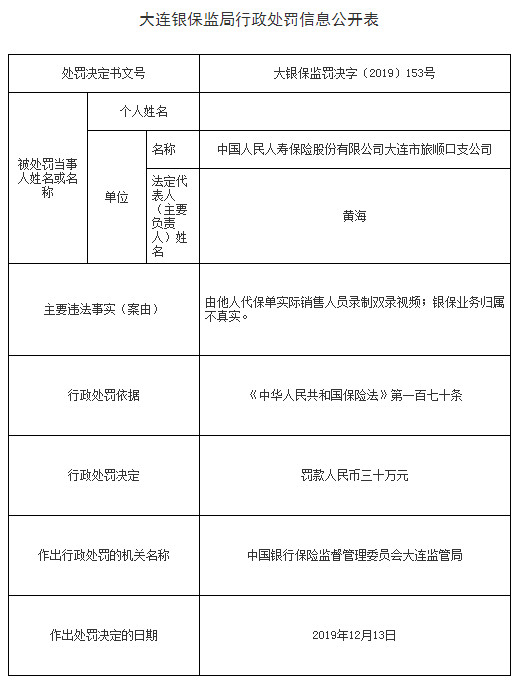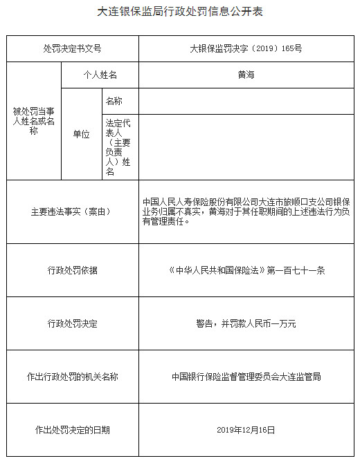 大连银保监局行政处罚信息公开表(大银保监罚决字〔2019〕165号)显示,中国人民人寿保险股份有限公司大连市旅顺口支公司银保业务归属不真实,黄海对于其任职期间的上述违法行为负有管理责任。根据《中华人民共和国保险法》第一百七十一条的规定,中国银行保险监督管理委员会大连监管局对其处以警告,并罚款人民币一万元。