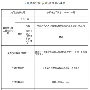 中国经济网北京12月24日讯 银保监会网站今日公布的大连银保监局行政处罚信息公开表(大银保监罚决字〔2019〕153号)显示,中国人民人寿保险股份有限公司大连市旅顺口支公司存在由他人代保单实际销售人员录制双录视频;银保业务归属不真实的违法行为。根据《中华人民共和国保险法》第一百七十条的规定,中国银行保险监督管理委员会大连监管局对其处以罚款人民币三十万元。
