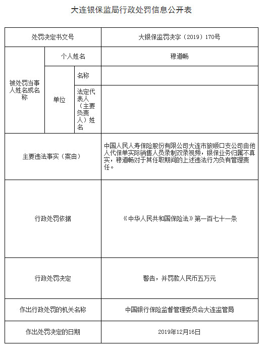 大连银保监局行政处罚信息公开表(大银保监罚决字〔2019〕165号)显示,中国人民人寿保险股份有限公司大连市旅顺口支公司由他人代保单实际销售人员录制双录视频,银保业务归属不真实,穆道畅对于其任职期间的上述违法行为负有管理责任。根据《中华人民共和国保险法》第一百七十一条的规定,中国银行保险监督管理委员会大连监管局对其处以警告,并罚款人民币五万元。