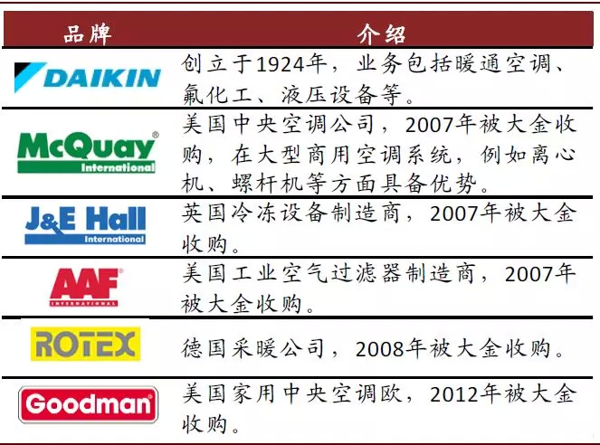 大金(DKILY.US)是多联机的发明者、领导者,对暖通空调行业发展有卓越的贡献。大金以产品力为核心竞争力,专注于中央空调市场,但在B2C的家用空调市场竞争力弱。大金的商业模式有别于竞争对手。欧美暖通空调龙头:联合技术(UTX.US)、英格索兰(IR.US)、江森自控(JCI.US)。这些是相关多元化模式(暖通空调、楼宇自动控制、安防系统、电梯等);日韩流行财阀模式:三星(SSNGY.US)、三菱等;中国暖通空调龙头是产业链一体化模式、家电多元化模式。