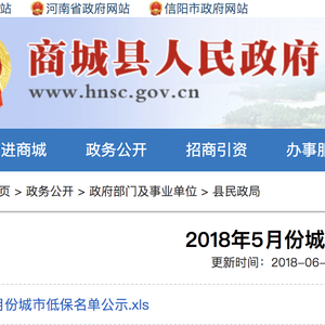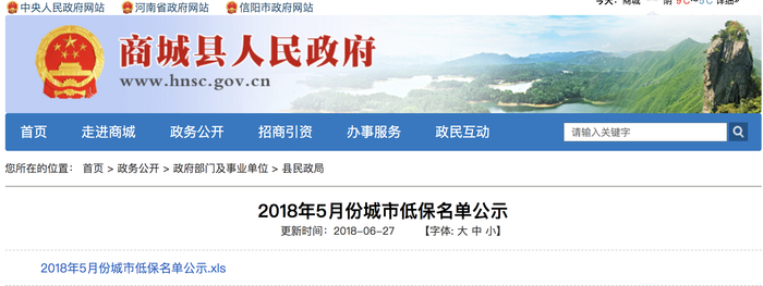 商城县人民政府官网于2018年6月27日发布名为《2018年5月份城市低保名单公示》的通告。(截图为部分人员名单)