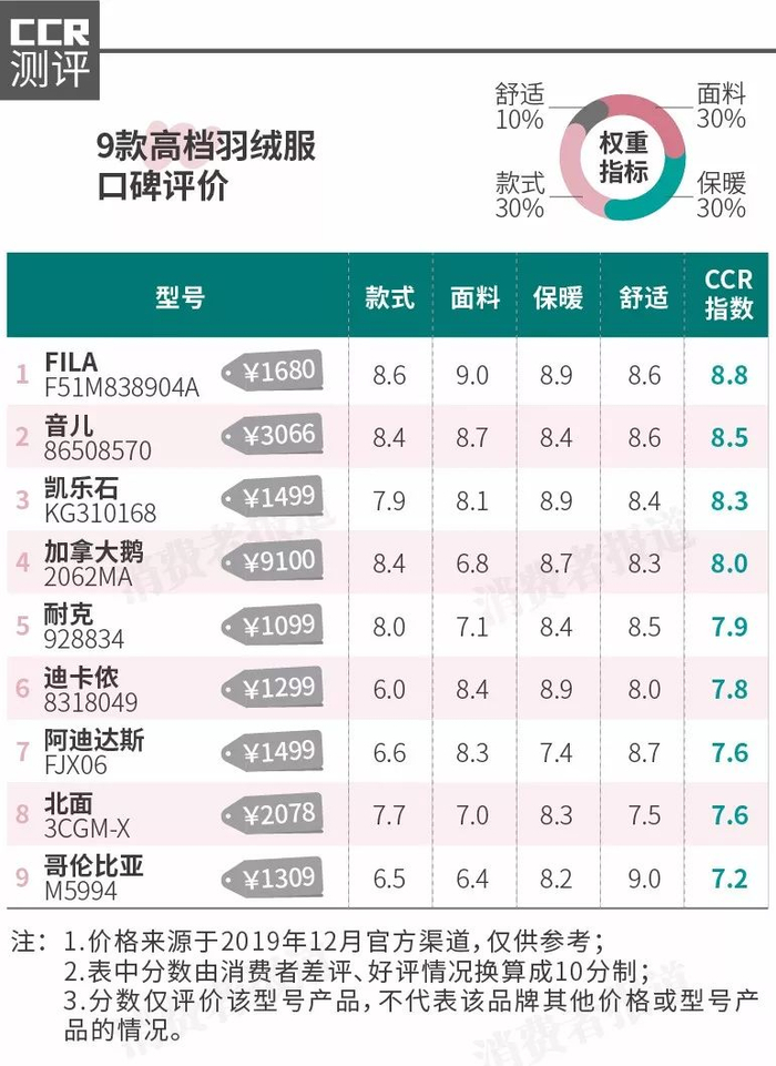 结果显示,28款平价羽绒服,国产品牌恒源祥、雅鹿得到最高分,CCR指数高达8.9。