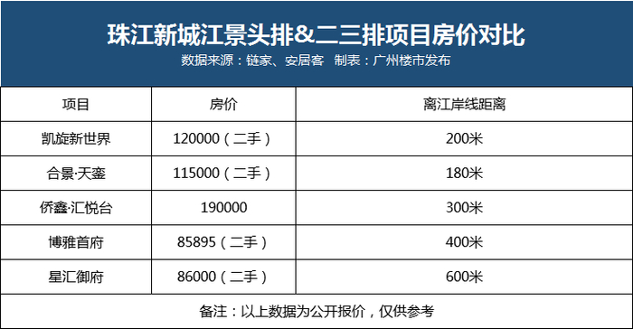 同在珠江新城,一线江景基本是10万+代名词。二三线望江项目,价格仅前者2/3。