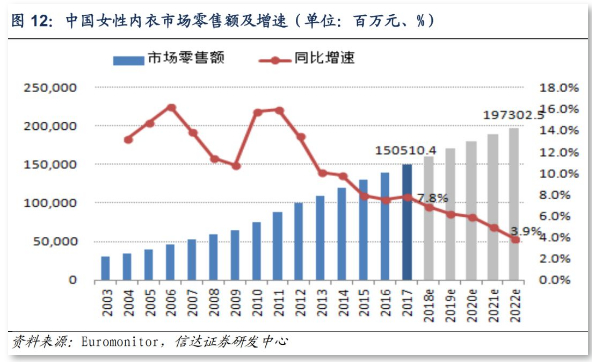 据中国产业调研网发布的《中国内衣市场现状调研与发展趋势分析报告》,预料未来三年的增速将保持在10%。据据 Euromonitor 预测,到2022年,中国女性内衣市场容量将达到1973亿元。
