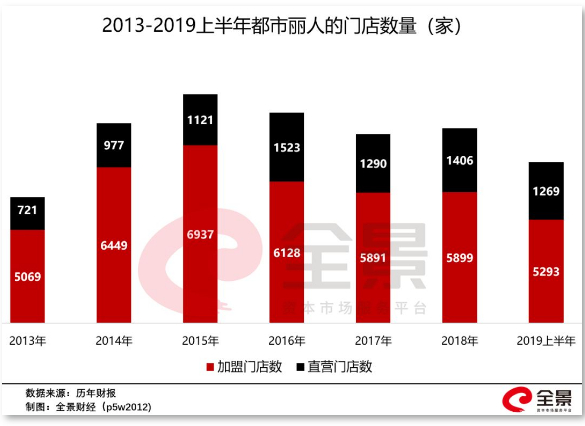 曾经气势汹汹的“万店计划”被迫中止,都市丽人开始在全国范围内关闭亏损门店,截止到2019上半年末,都市丽人的全国门店数量为6562家,较2015年巅峰时期下降超1496家。