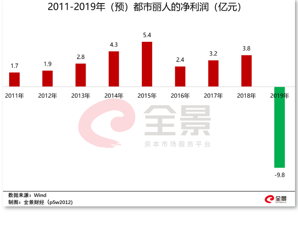 12月23日,都市丽人披露2019年业绩预告,预计2019全年净利润将亏损不少于9.8亿元。而回顾都市丽人近9年以来的业绩,2019年巨亏9.8亿元,实属罕见: