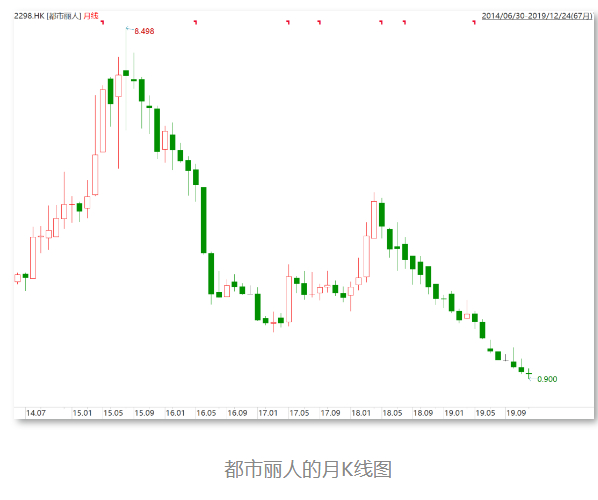 在业绩崩塌的同时,都市丽人的股价亦一路向南。其在2015年8月,股价创下历史最高点8.5元/股,而业绩巨亏预告披露后,股价一度跌至0.92元/股,期间的最大跌幅超89%,总市值仅剩22.7亿港元。