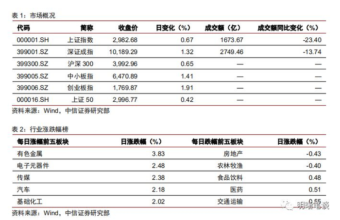 2019年12月24日,银存间质押式回购加权利率涨跌互现,隔夜、7天、14天、21天和1个月分别变动-43bps、-37.08bps、15.36bps、30.88bps和23.04bps至1.10%、1.55%、3.04%、3.17%和3.14%。国债到期收益率全面下行,1年、3年、5年、10年分别变动-5.37bps、-2.24bps、-1.40bps、-1.26bps至2.50%、2.76%、2.93%、3.15%。上证指数涨0.67%至2982.68;深证成指涨1.32%至10189.29;创业板指涨1.91%至1769.87。