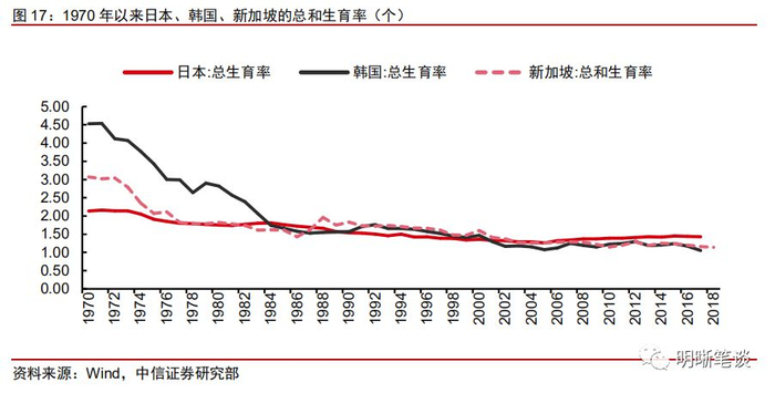 应对低生育率的他山之石。20世纪末至21世纪初,日本、韩国、新加坡都曾经历过生育率水平快速下降,结合日本、韩国、新加坡的应对经验,我们认为解决低生育水平需要完备的组织机构、政策法律体系,同时也需要政府部门提供充足的经费来源以应对补贴、税收减免等方面的开支。
