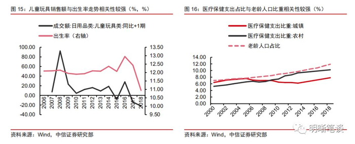理论上,人口结构的变化可能带来消费结构的改变,长期看低生育率和老龄化可能会降低汽车、地产的购置需求,同时也将增加医疗保健支出占比。理论上,青年人相对中老年人有着更强的购房、购车需求,因此随着生育率的持续下探,我国的人口结构将继续向老龄化倾斜,在购买力与消费习惯不变的情况下,对汽车、地产的配置需求或将趋于回落;另一方面,老年人对药物、医疗器材等医疗保健用品的需求更强,因此长期看居民对医疗保健类支出的比重有望提高;此外,随着生育率的回落,与育儿相关的支出如对婴儿用品、儿童玩具的购买以及早教、培训的支出也将减少。对于具体行业而言,随着生育率的持续回落,“育儿”产业链相关行业的增长可能相对有限,但婴儿用品及药品、儿童服装、早教和培训机构、儿童玩具等行业的优质产品也有望脱颖而出;另一方面,与“养老”相关的行业如医药制造、医疗器械、健康服务等相关行业将迎来较为广阔的发展前景。