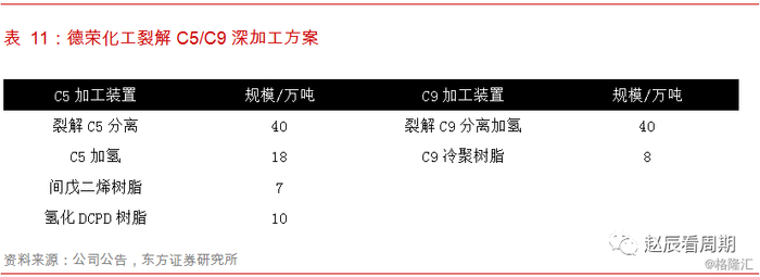 浙石化C4产业链加工采用了较为经典的丁二烯抽提-MTBE/烷基化路线,由于收入占比较低且与大多数炼厂较为类似,在此不做详细分析。我们认为其化工另一大特色在于C5/C9深加工领域,C5/C9组分是裂解汽油加氢过程中的副产品,即使目前规模最大的140万吨乙烯蒸汽裂解对应产量也仅10-20万吨,传统小炼厂只有万吨左右,由于产量较少,无法达到进一步深加工的经济规模,一般炼厂均作为原料直接外售。而浙石化受益于炼油和乙烯的规模优势,两期合计C5产量32万吨,C9产量14万吨,天然就具备了继续规模化深度加工的能力。去年底浙石化与德美化工增资德荣化工,增资后德美持股比例55%,浙石化持股比例45%,德荣化工将依托浙石化丰富的裂解C5/C9资源,建设裂解副产品下游综合利用项目,生产间戊二烯树脂、DCPD树脂、C9冷聚树脂等多种高附加值衍生物。项目总投资32.5亿元,分两期建设,一期与浙石化二期同步投产,二期晚于一期半年。我们认为德容化工裂解C5/C9项目具备了原料供应充裕、生产技术先进、产品差异化程度高、贴近终端消费市场等诸多优势,其未来盈利能力也值得期待,有望为浙石化贡献稳定的投资收益。