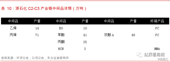 公司每期聚丙烯装置规模约90(45+45)万吨,我们测算聚合加工费约500元/吨,相比行业内目前大多数20-30万吨产能有100元/吨的成本优势,两期合计盈利优势1.7亿。除聚丙烯规模优势外,浙石化在C3产业链的最大特色是技术壁垒高、产业协同效应强,公司选择了“丙烯-苯酚/丙酮-双酚A-PC”和“丙烯-丙酮/丙烯腈-MMA”两条工艺路线,加工流程长深度足,最终外售的PC和丙烯腈都属于壁垒很强的高附加值产品。公司PC选择了非光气法工艺路线,相较主流的界面缩聚法吨加工成本低1000元/吨,两期对应盈利优势约5.2亿。同时从物料平衡上看,PC和丙烯腈所需的绝大部分原料均为自供,二期投产后苯酚/丙酮、双酚A无外售商品量,也节省了采购、销售及物流费用,浙石化两期中间产品流通量约210万吨,以较为保守的100元/吨运费测算,运费节省约2亿。另外按照目前规划方案,浙石化一期和二期分别将有7万吨和61万吨丙烯外售,未来存在新增下游装置,继续深加工的调整空间,其盈利优势也有望进一步增强。