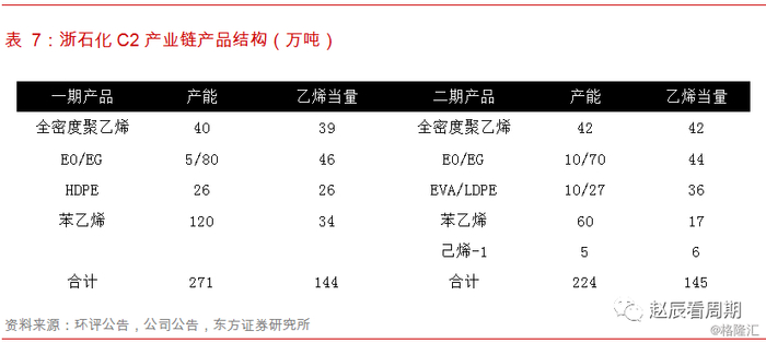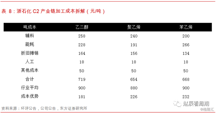 浙石化无商品乙烯外售,全部乙烯均继续深加工,产品方案上选择了市场容量大、对外依存度高的几类大宗品,一期为66万吨聚乙烯、80万吨乙二醇(配套5万吨EO供PC用)和120万吨苯乙烯,二期为70万吨聚乙烯(配套10万吨EVA外售)、70万吨乙二醇(配套10万吨EO,5万吨供PC用,5万吨外售)和60万吨苯乙烯。我们判断浙石化在C2产业链上的核心竞争力在于规模化带来的成本优势,以乙二醇为例,浙石化一期乙二醇规模约80万吨,而行业内存量油头和煤头乙二醇装置规模在20-30万吨左右,相应浙石化乙烯至乙二醇吨加工成本约720元,较油头行业平均低180元/吨。对聚乙烯和苯乙烯,浙石化吨加工成本也均较行业平均低200元左右,三大产品合计盈利优势约9亿。