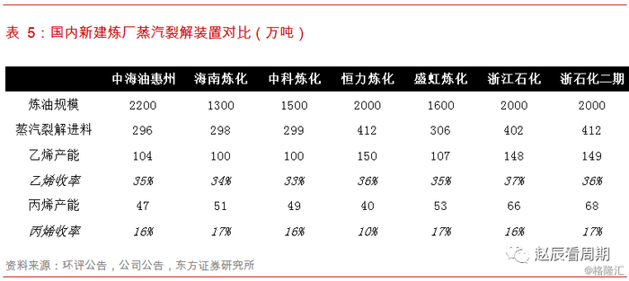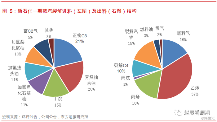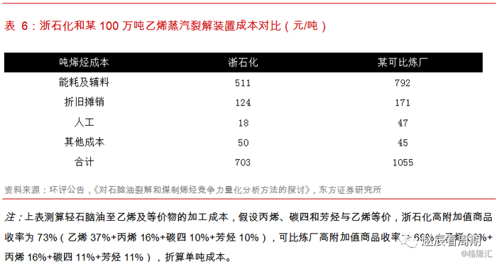 浙石化选择了蒸汽裂解制乙烯作为化工区龙头装置,受益于规模效应,享有以下几点优势:1)原料种类丰富:浙石化炼油区实现了各组分的吃干榨净,为乙烯装置提供了丰富原料,以一期为例,原料来源包括乙烷气、丁烷、正构C5、芳烃抽余油、加氢石脑油等,相比纯石脑油进料企业原料优势显著;2)加工成本低:浙石化单套蒸汽裂解规模为400万吨,是国内目前最大的乙烯装置之一,因此吨投资额较行业平均低50元,另外通过不同压力等级蒸汽的梯次利用和自备热电,吨能耗降低280元;3)商品收率高:浙石化炼油区增设C5正异构分离装置,因此蒸汽裂解原料中正构烷烃占比高,乙烯收率约为37%,大幅高于存量炼厂32%的水平,较其他新建炼厂也还要高约2%,高附加值商品收率为73%,高于行业平均的69%,也摊薄了单吨成本。根据我们测算,浙石化蒸汽裂解加工成本相较行业平均低350元/吨,两期合计由此带来的盈利优势约21亿。