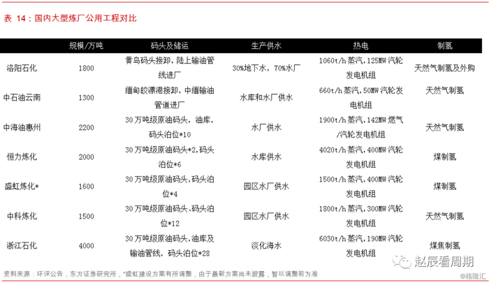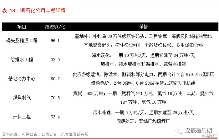 公共工程配套完善:浙石化自建公用工程包括基地码头、原油储运及海底管线、海水淡化工程、海水取排水工程、基地动力中心、污水处理厂和固废处理中心(详见表13),涵盖了原料和产成品物流、供水、供电、供热和三废处理,整体配套十分完善。但受水深和航道限制,浙石化所在鱼山岛无法建设大型原油码头,因此由舟山政府在外钓岛配套建设30万吨级原油码头,原油接卸后经陆上输油管线-马目油库-海底输油管线至鱼山岛基地,目前外钓岛码头和海底输油管线均已正式投入运营。且浙江自贸区还将加大港口码头、储罐、管线、锚地等油品相关基础设施的建设力度,打造舟山国际油品储运中心,未来浙石化油品进出和中转将更为便捷。我们认为虽然浙石化没有享受直接的税收减免,但桥梁、码头、油库等相关基础设施建设其实也是一种隐形的补贴,体现了政府的重视和支持,也有效降低了公司物流成本。