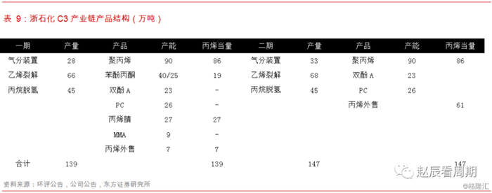 浙石化丙烯来源丰富多样,包括炼油区气分、丙烷脱氢和蒸汽裂解三大装置,每期产能约140万吨左右,综合收率远超一般炼厂,充裕的丙烯原料也保证了浙石化在下游方案设计上有很高的灵活性。其产品结构一期为90万吨聚丙烯(其中54万吨均聚,27万吨抗聚,8万吨共聚),40/25万吨苯酚/丙酮(其中21/12万吨自用,其余外售,二期建成后全部自用),23万吨双酚A(全部用于PC),26万吨PC,26万吨丙烯腈和9万吨MMA,二期为90万吨聚丙烯,23万吨双酚A(全部用于PC)和26万吨PC。