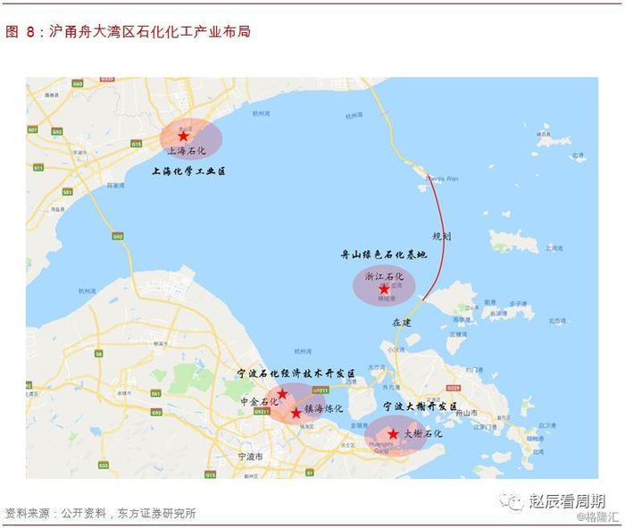 3.区位优势分析:炼化本质上很像商业地产,核心竞争力就来自location、location、location。区位好的企业天然运输和销售成本就低,竞争优势会非常明显。而舟山基地背靠广袤的长三角经济带和沪甬舟炼化产业集群,周边有2300万吨的镇海炼化、800万吨大榭石化和1600万吨的上海石化。整个杭州湾地区远期炼化规模有望达到1亿吨,未来将比肩美国大湾区,成为全球炼化产业集中度最高的两极之一,浙石化作为其中引领者将充分受益。