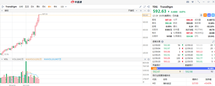 排名第九位的是TransDigm,区间涨幅超过了21倍。TransDigm这家公司是目前几乎所有商用和军用飞机上的航空航天部件、系统和子系统的全球生产商、设计师和供应商。
