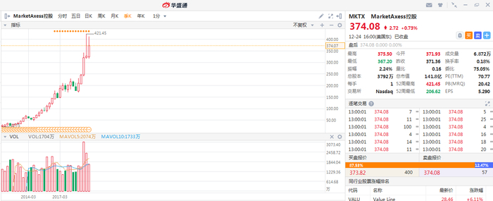 涨幅排名第四的是市场轴(MarketAxess)公司,近十年的涨幅达到了30.6倍。这家公司被誉为“彻底改变了债券市场”,极大地推进了电子化交易的进程。