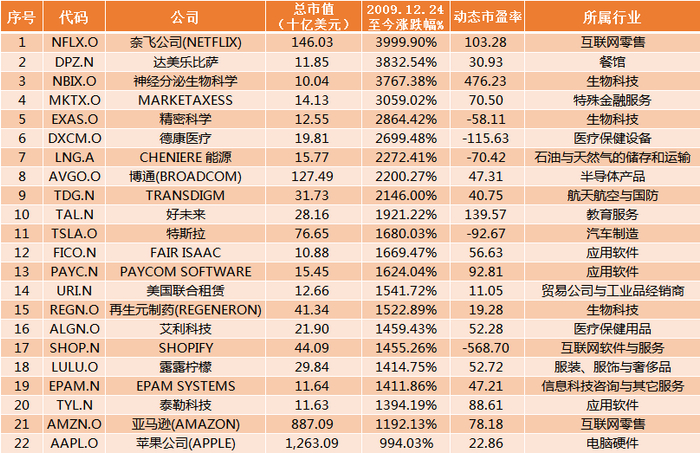 笔者根据wind数据统计,对2009年12月24日至2019年12月24日美股全市场公司的涨幅做了一个排序。筛选出了20家涨幅靠前的公司,同时这20家公司的最新市值也满足100亿美元以上这个条件。